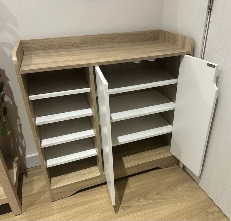 Mueble de recibidor con un diseño moderno y funcional. - Combinación de colores marrón y blanco. - Estructura principal de madera. - Puertas de cierre suave. - Estantes abiertos para almacenamiento adicional. Medidas 80x80x33