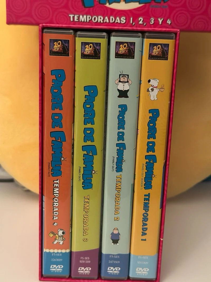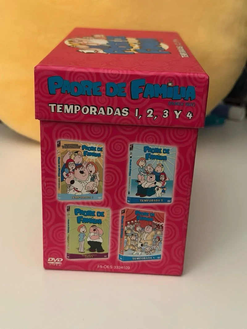Caja de DVD de Padre de Familia que incluye las temporadas 1, 2, 3 y 4. - Diseño de caja en color rosa con los personajes. - Título en español.