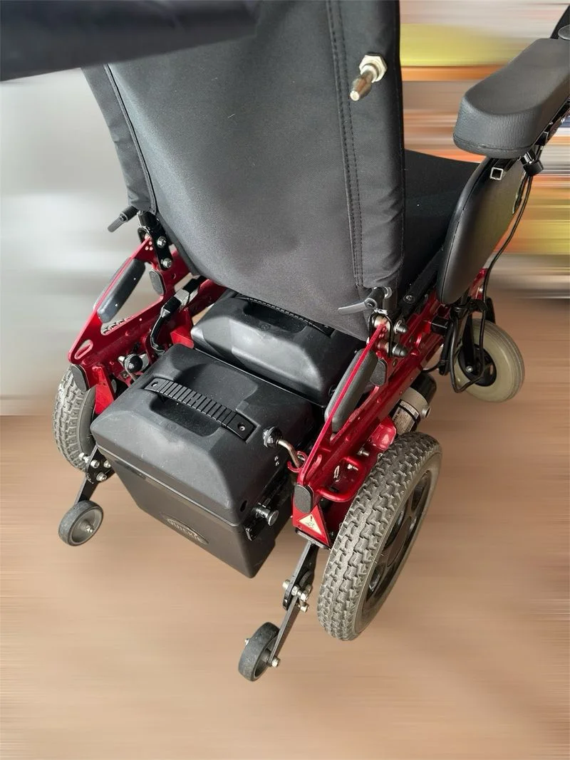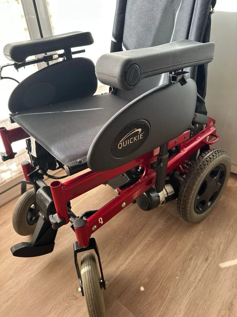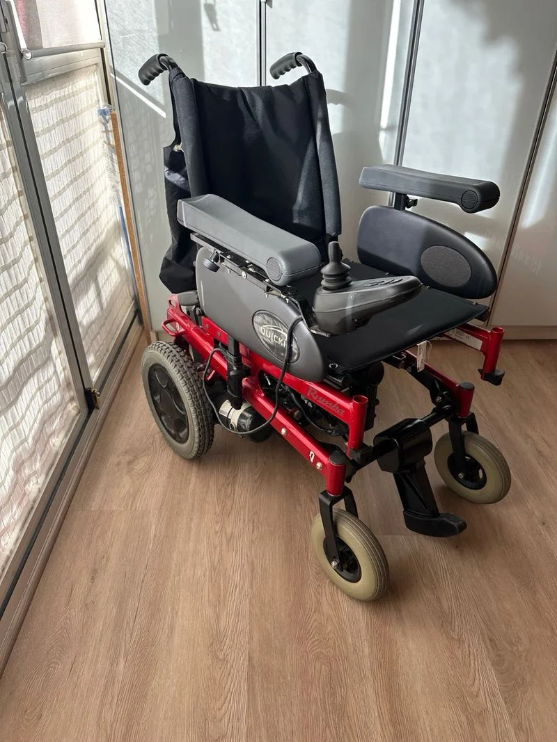 Silla de ruedas eléctrica Quickie Rumba mejorada (mas bateria y mejores ruedas) en color rojo y negro. Ni un mes de uso. Se puede ver y probar. - Doble batería nueva valor 500e - Estructura metálica. - Reposabrazos acolchados. - Ruedas traseras grandes y delanteras pequeñas. Las 4 macizas. - Joystick de control.